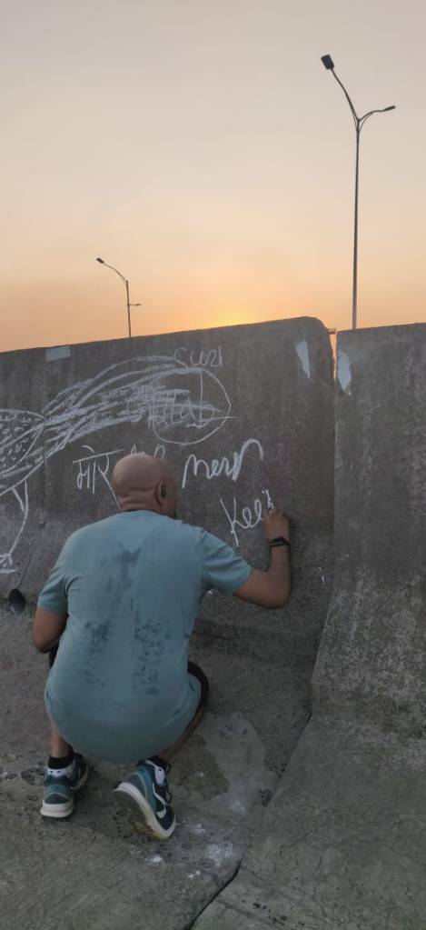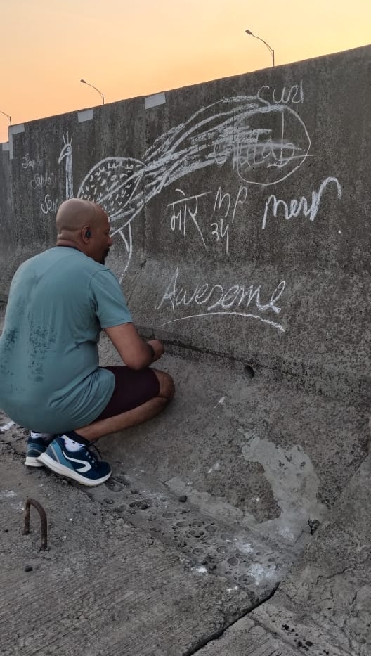 This art was by an unknown artist on a flyover construction concrete slab, placed on the Khandeshwar bridge.