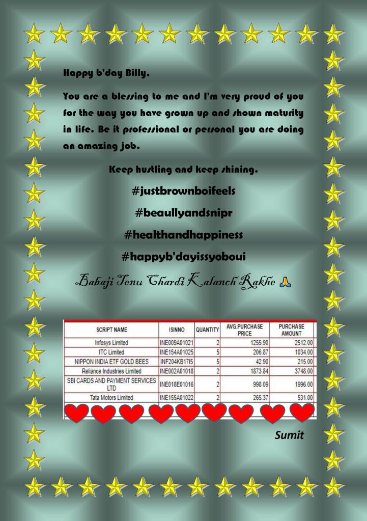 This week Mr Anirudh is celebrating his 25th birthday. This amazing, soft spoken, young engineer will be receiving Rs. 50000/- worth shares we have picked up according to the instructions his father gave us. Here it is “Jithne ka Cake Uthne ka++ Investment”.